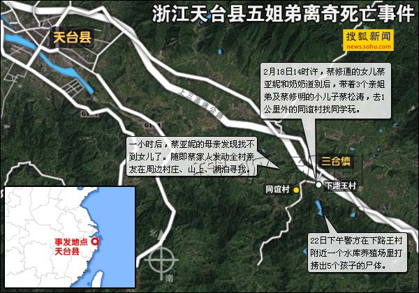 18日下午,居住在浙江天臺縣下路王村的蔡家5名孩子外出玩耍,臨行前,告知奶奶王東英要去同誼村找同學,隨后就再也沒有歸來。22日,5名孩子的尸體在龍珠潭水庫下游魚塘蓄水池被發(fā)現(xiàn)。昨日下午3時,浙江天臺縣公安局就“二·一八”事件第四次召開新聞發(fā)布會,通報5名失蹤兒童尸檢初步結(jié)果,均發(fā)現(xiàn)孩子在肺部出現(xiàn)水氣腫,并有大量積水,尸體無外傷、扼頸跡象。警方初步調(diào)查稱5名兒童為意外溺亡,具體死亡原因要等到尸檢報告出來后才能最終確定。據(jù)悉,相關(guān)死因?qū)⒂诮袢展肌?/P>