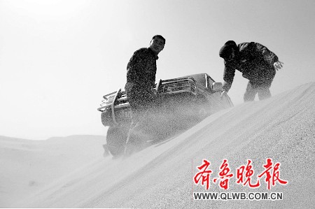 24日,在開往沙漠深處的路上,車輪陷入沙里,挖沙是沙漠司機(jī)的家常便飯。本報特派記者張中攝
