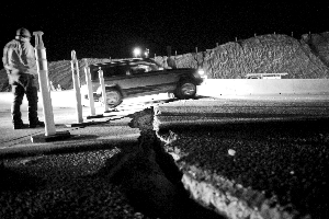4月4日,在墨西哥下加利福尼亞州,市政人員查看墨西卡利和蒂華納之間道路上的裂縫。新華社發