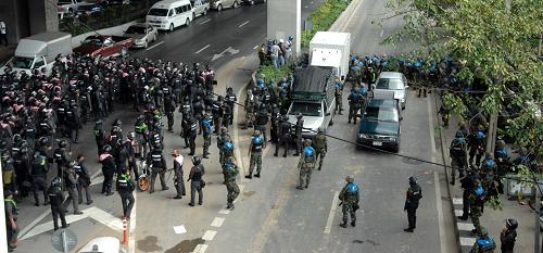 為阻止“紅衫軍”北上,泰國士兵鳴槍示警,并向示威者發射催淚瓦斯。雙方沖突致死1名士兵,另有18人受傷。