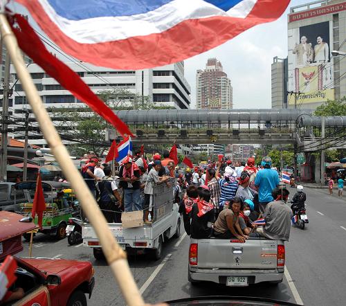 美聯社報道,“紅衫軍”持續數周的示威游行致曼谷幾大商業區幾近陷入“癱瘓”,而“紅衫軍”28日宣布將擴大示威范圍。28日下午,約1000名“紅衫軍”成員駕駛摩托車與皮卡車沿曼谷廊曼機場亞洲一號高速公路向曼谷北郊挺進。