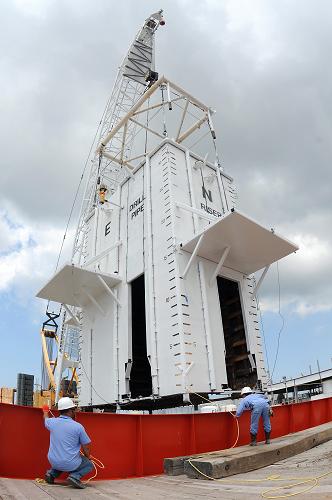 5月5日,在美國路易斯安那的港口,工作人員在船上協助吊裝漏油清理設備。英國石油公司當日發布公告說,墨西哥灣原油泄漏事故油井的3個漏油點中,已有一個被成功封堵,這將有助于接下來的控制漏油行動。新華社/路透