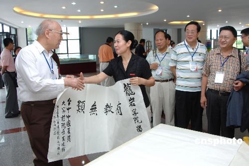八月八日,臺灣客家文化專家學者參觀福建龍巖學院,臺灣中國醫藥大學前院長王廷輔(前排左一)參觀龍巖學院時書贈:“有教無類”。 中新社發 鄭祚聲 攝