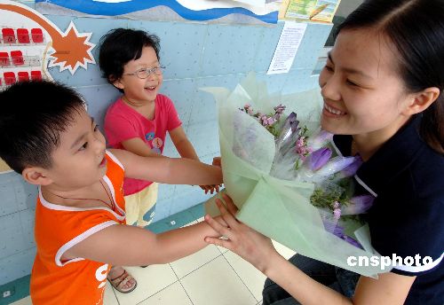 在福州的臺商子女向老師鮮花。 中新社資料圖 劉可耕 攝
