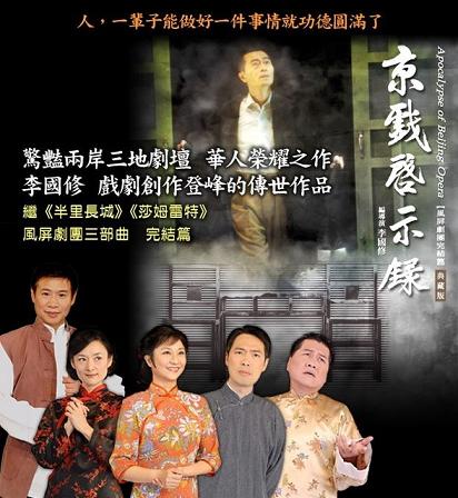 令人耳目一新的《京戲啟示錄》典藏版,除舞臺(tái)有全新視覺(jué)感受外,更是由臺(tái)灣實(shí)力派演員李國(guó)修、朱陸豪、楊麗音、樊光耀、譚艾珍、黃宇琳、朱德剛、劉珊珊,搭配新生代小生孫國(guó)豪的演出陣容,輔以西方交響樂(lè)和京戲鑼鼓點(diǎn)融合而成的戲曲配樂(lè),使觀(guān)眾在《京戲啟示錄》層層蒼涼的故事中,得到一絲生命的啟思。