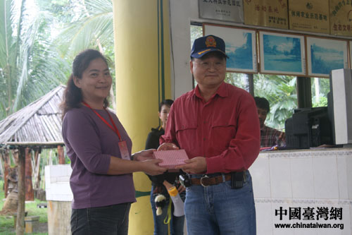 海南臺商林保森接受臺灣政治大學代表贈送的紀念品