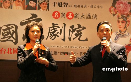 一月五日下午,當紅大陸京劇名角--國家京劇院梅派青衣李勝素(左)、頭牌老生于魁智,在臺北記者會上清唱拿手傳統京劇選段。本月八日至十三日,他們將同大陸京劇各流派當紅名角聯袂登臺獻藝,在臺北連演《四郎探母》、《貴妃醉酒》等八場共十一出傳統京劇大戲,作為送給臺灣觀眾的新年禮物。 中新社發 孫自法 攝