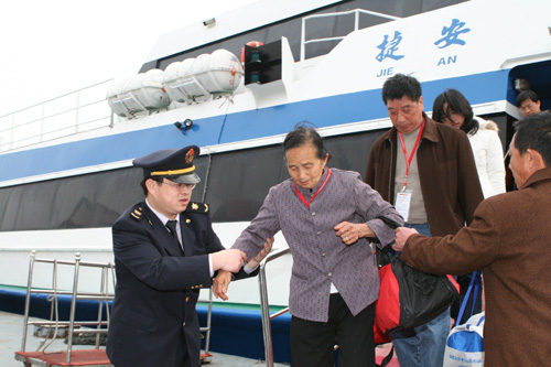臺輪金星號將于當天下午3時30分左右靠泊和平碼頭。在此條航線上跑的兩岸各4艘客輪中,“金星”號客輪是最新加盟的,去年10月才剛剛投入。家在高雄的大副高建輝先生表示,對這條航線很有信心。他一邊指著船上張掛的各色彩燈、彩帶和春聯(lián),一邊很坦然地告訴記者,自己根就在福建,去年元宵節(jié)還專門到長樂尋根!皟砂兑患矣H,不管做什么都很容易溝通”,他手里拿著兩盤全新的DVD音樂帶《新年熱鬧鬧》、《雙星報喜》,說,“這些都是昨天在廈門買的。掛上了紅艷艷的彩帶啊什么的,真得感到過年好溫馨,船一開,我們就把這兩個帶子放出來給大家聽,一定會更熱鬧!”