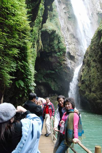 2月29日,臺灣客人在峽谷群景區內拍照紀念。