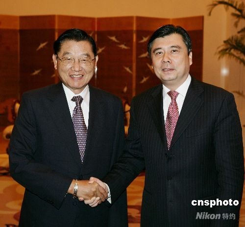 4月26日,中國國民黨副主席江丙坤抵蘇州,中共蘇州市委副書記、市長閻立(右)會見了江丙坤(左)一行。 中新社發 志強 攝