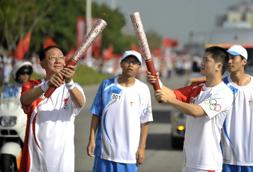 5月9日,奧運(yùn)火炬手楊平和(前左)與劉志杰在傳遞過(guò)程中交接。當(dāng)日,北京奧運(yùn)圣火傳遞活動(dòng)在廣東省惠州市舉行。新華社記者劉大偉攝