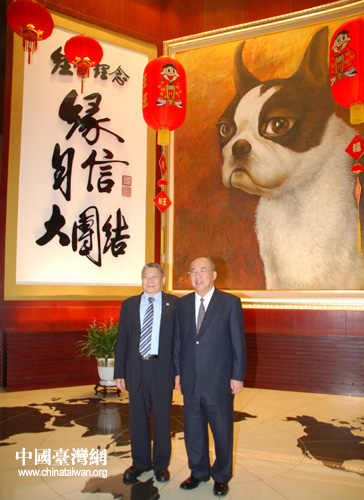 吳伯雄與蔡衍明,在蔡衍明幼時的最愛“黑皮”畫像下合影。(攝影:中國臺灣網 田云鵬)