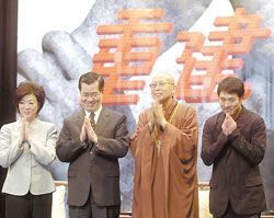 臺灣法鼓山6月1日舉行座談會,法鼓山創辦人圣嚴法師(右二)、蕭萬長(左二)、臺積電文教基金會董事張淑芬(左一)及影壇巨星李連杰(右一)等人在座談開始前,雙手合十,向場內民眾致意。臺灣《中國時報》劉宗龍攝