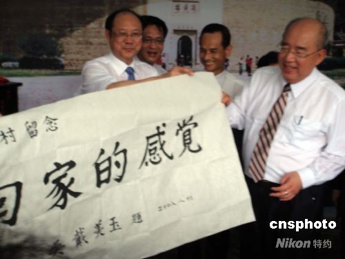 8月15日18時(shí)50分左右,中國(guó)國(guó)民黨主席吳伯雄結(jié)束赴閩謁祖之旅,乘周末包機(jī)從廈門(mén)直航返臺(tái)。圖為吳伯雄在他的家鄉(xiāng)福建永定縣下洋鎮(zhèn)思賢村展示其夫人的題詞,這正是他此行返鄉(xiāng)謁祖內(nèi)心感受的真實(shí)寫(xiě)照。 中新社發(fā) 陳悅 攝