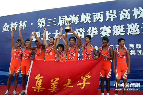 中國(guó)臺(tái)灣網(wǎng)8月30日廈門(mén)消息 “金橋杯”第三屆海峽兩岸高校賽艇挑戰(zhàn)賽暨北大—清華賽艇邀請(qǐng)賽今天下午舉行,廈門(mén)集美大學(xué)以8分32秒37蟬聯(lián)冠軍,第二次參賽的臺(tái)灣輔仁大學(xué)以8分39秒07排名第二。兩隊(duì)成績(jī)均比去年有不少提高。同時(shí)舉辦的北大清華賽艇邀請(qǐng)賽,因率先沖過(guò)終點(diǎn)的清華大學(xué)被判違規(guī),北大意外蟬聯(lián)冠軍。