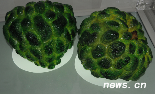 琉璃制作的臺灣水果釋迦。在臺灣“祥云小屋”,用琉璃制作的水果栩栩如生,令人驚嘆。 新華網 前衛 攝