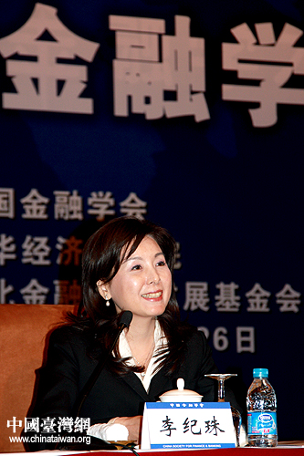 李紀(jì)珠以臺(tái)灣金融代表團(tuán)首席顧問的身份在研討會(huì)閉幕式上進(jìn)行發(fā)言。她表示:在兩岸實(shí)體經(jīng)濟(jì)聯(lián)系愈發(fā)緊密的背景下,雙方金融合作已是大勢(shì)所趨。兩岸間對(duì)于加速金融監(jiān)理機(jī)制的建立已有強(qiáng)烈共識(shí)。希望雙方盡早建立金融監(jiān)管制度,為兩岸金融合作實(shí)現(xiàn)突破性進(jìn)展、攜手對(duì)抗全球金融危機(jī)奠定堅(jiān)實(shí)基礎(chǔ)。