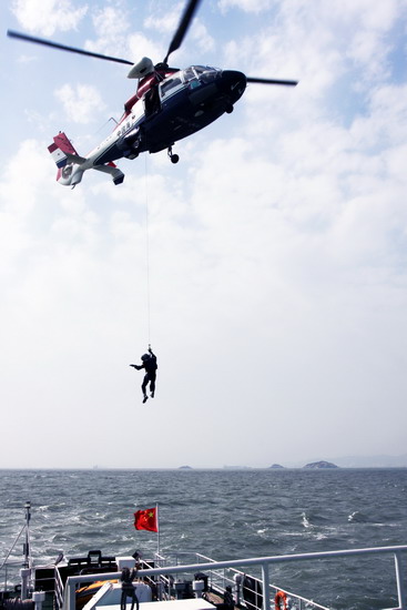 3月25日,在福建省廈門港外海鎮海角海域,東海第二救助飛行隊B7106號救助直升機與福建省最大的執法公務船海巡132號展開海空聯合救助演練。當日,廈門海事局與東海第二救助飛行隊在兩岸直航航線上展開海空聯合巡航救助一體化演練。新華社發