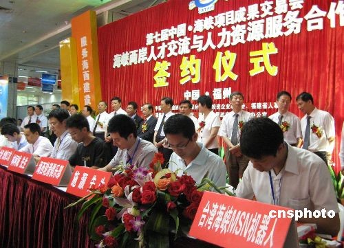 6月17日,首屆海峽兩岸大學生創(chuàng)業(yè)項目對接洽談會上,臺灣與大陸共六個項目的企業(yè)代表與六名創(chuàng)業(yè)大學生代表在福州簽訂意向協(xié)議書,展開創(chuàng)業(yè)項目對接。 中新社發(fā) 張彩林 攝