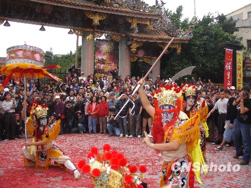 兩岸信眾在臺北保安宮前為保生大帝慶生而舉辦的盛大民俗廟會藝陣表演從上午10時拉開帷幕,來自高雄的農(nóng)民兄弟率先獻演一場精彩的“宋江陣”。而后車鼓陣、花鼓陣、高蹺陣、十二婆祖陣、八家將等傳統(tǒng)的閩南廟會表演藝陣也紛紛登場,數(shù)以千計的臺灣民眾駐足觀賞,保安宮廟埕前四周人頭攢動。