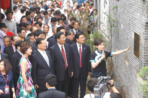 中國國民黨榮譽主席連戰和夫人連方瑀在山東省政協主席劉偉等陪同下參觀臺兒莊古城