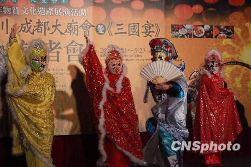 5月20日,來自四川的演員在臺北的成都大廟會記者會上表演川劇變臉。名列大陸四大廟會之一的四川成都大廟會,首度跨海來臺展示四川最具代表性的非物質文化遺產,21日將在臺北登場。 中新社發 羅欽文 攝