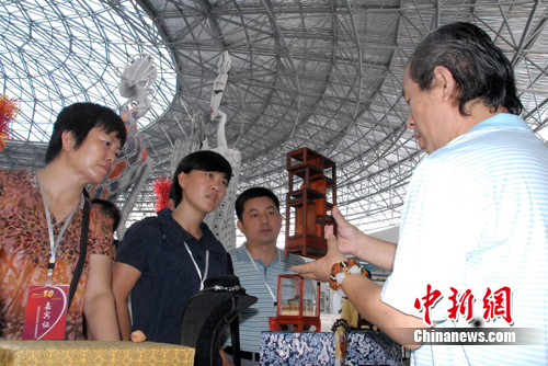 在東南東文化創(chuàng)意產(chǎn)業(yè)園內舉辦的2010海峽兩岸特色產(chǎn)品博覽會吸引了全國各地的觀眾,圖為參展藝術家向觀眾展示自己的作品。