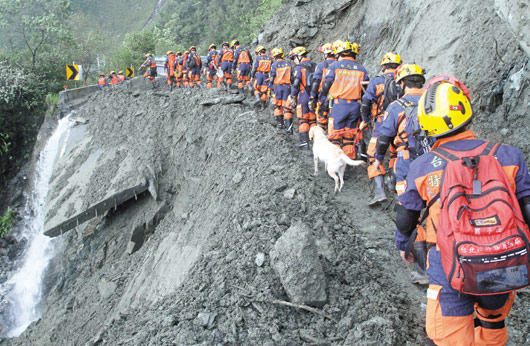 大批臺(tái)灣搜救人員帶著器材和搜救犬,搶進(jìn)處處塌方的蘇花公路,搜尋在風(fēng)災(zāi)中失聯(lián)的26人。 來源:臺(tái)灣《聯(lián)合報(bào)》
