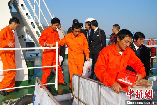 12月5日下午,12名獲救船員成功抵達福建寧德城澳碼頭。中新社發(fā) 李松 攝