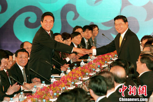 12月21日上午,海協(xié)會會長陳云林與海基會董事長江丙坤的兩會領(lǐng)導(dǎo)人第六次會談在臺北圓山飯店登場。圖為陳江二人在會談開始時(shí)相互握手致意。 中新社記者 黃少華 攝