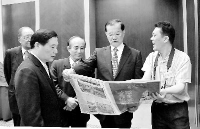 5月9日,連戰在會見黃小晶省長率領的福建省經貿文化交流團前,看到本報記者遞上的《福建日報》特刊上刊發他回龍海祭祖的圖片時非常高興。 陳夢婕 攝