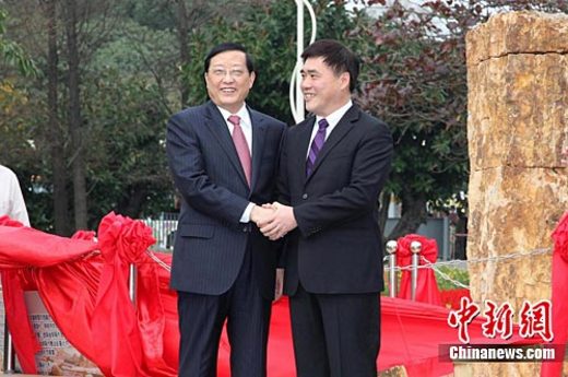 2月17日,正在臺灣參訪的遼寧省省長陳政高(左)與臺北市長郝龍斌(右)在臺北花博會共同為三顆木化石揭幕,該木化石的年齡已近1.5億年,是遼寧省贈與臺北市的一件珍貴禮品,寓意兩地關(guān)系“天長地久”。中新社記者 符永康 攝