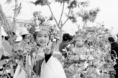 今年的蜈蚣閣有32節(jié),長度近130米,共有64個古裝扮相的孩子坐在上面。 蜈蚣閣以多節(jié)“閣棚”連成蜈蚣身,“閣棚”飾以各種彩綢花卉、飛禽走獸,每塊“閣棚”之間以活榫相接成一串,“閣棚”上面坐著的少年兒童身著戲服,打扮成古代的帝王將相、文武百官或大家閨秀(右圖),服裝艷麗,非常吸引人。 (通訊員 鄭偉明 鄭美玲 記者 張永定 文/圖)