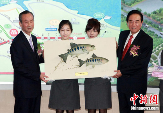 2月27日,大陸海協(xié)會(huì)會(huì)長(zhǎng)陳云林一行來(lái)到位于臺(tái)灣桃園縣的遠(yuǎn)雄自由貿(mào)易港區(qū)參訪,遠(yuǎn)雄企業(yè)團(tuán)董事長(zhǎng)趙藤雄(左一)向陳云林致贈(zèng)一幅“臺(tái)灣鮭魚(yú)”紀(jì)念品。中新社記者 符永康 攝