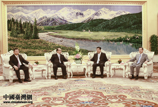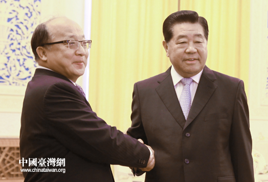 7日下午,中共中央政治局常委、全國政協(xié)主席賈慶林在人民大會堂會見來京參訪的臺灣臺中市市長胡志強一行。(中國臺灣網(wǎng) 陳佳慧 攝)