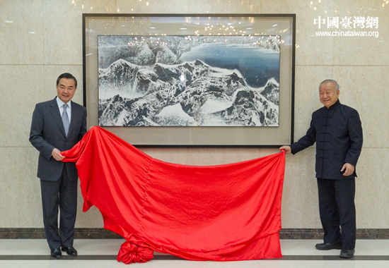 中共中央臺辦、國務院臺辦主任王毅與臺灣著名畫家劉國松共同為山水畫作《天池》揭幕。(中國臺灣網發 鄧鴻偉攝)