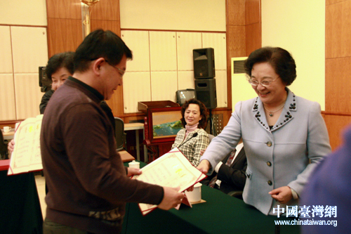 全國(guó)政協(xié)副主席、臺(tái)盟中央主席林文漪向臺(tái)盟受到表彰的先進(jìn)集體和個(gè)人頒發(fā)榮譽(yù)證書。(中國(guó)臺(tái)灣網(wǎng) 王怡然 攝)