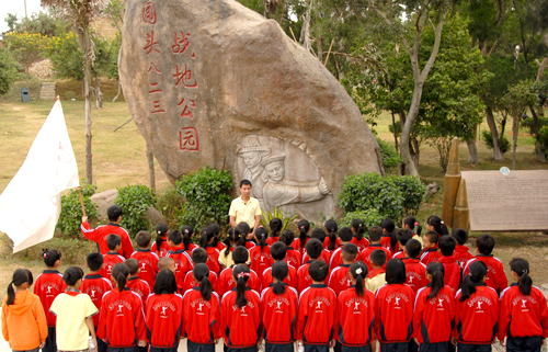 圍頭村主任洪水平在八·二三公園給學(xué)生講歷史。(夏庚元 攝)