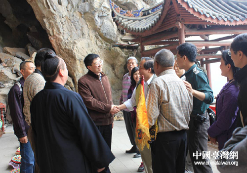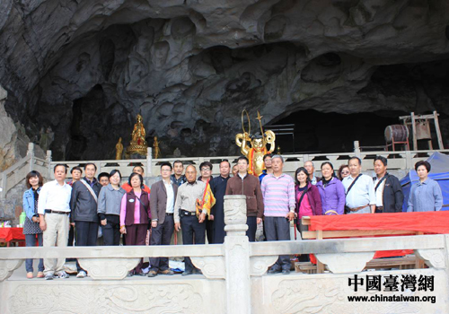 陳福林一行與臺(tái)灣游客在乾元山金光洞前合影留念。(圖片來(lái)源:綿陽(yáng)市臺(tái)辦)