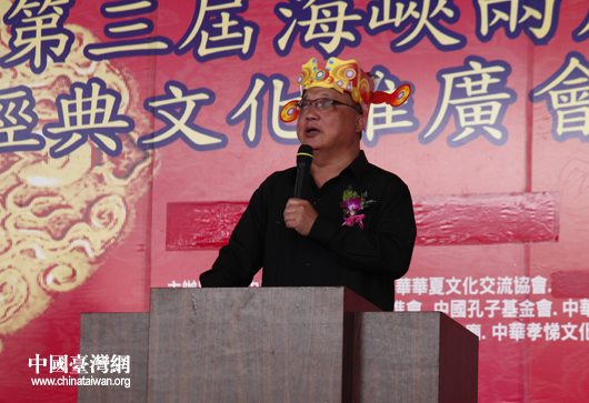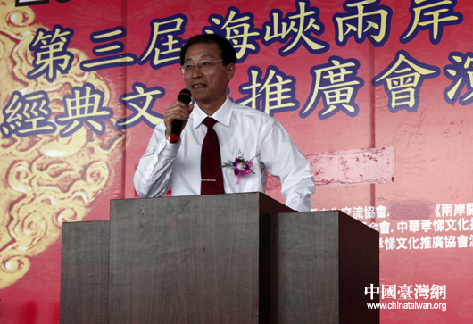 濟南市教育學會參訪團團長鄒衛(wèi)平在第三屆海峽兩岸經(jīng)典文化推廣會演致辭(中國臺灣網(wǎng) 邢同林 攝)