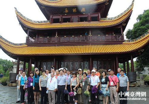 高雄市新聞參訪團與湖南省臺辦、岳陽市陪同領導在岳陽樓前合影。(圖片來源:岳陽市臺辦)