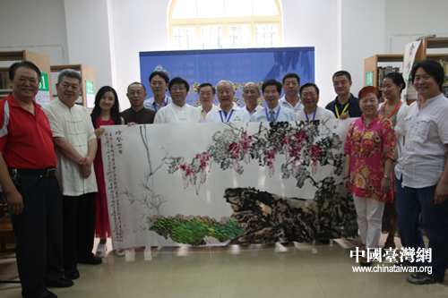 這時,大明湖吐艷的荷花,湖畔掩映在綠柳中古色古香的小樓,小樓中兩岸書畫家合壁的巨幅畫作的暗香,以及從小樓中飄揚出的古琴與蕭的悠揚,伴著兩岸畫家的歡聲笑語,回蕩在大明湖畔。(中國臺灣網(wǎng) 蕪同)