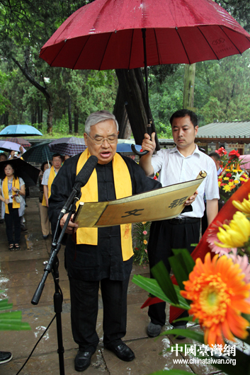“情系齊魯——兩岸文化聯(lián)誼行”臺灣嘉賓團(tuán)顧問、臺灣世新大學(xué)講座教授曾永義現(xiàn)場恭讀祭文。(中國臺灣網(wǎng) 芮益芳 攝)