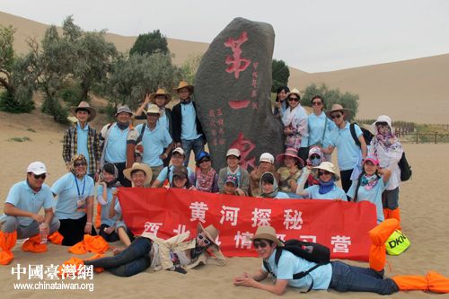 “黃河探秘—西北風(fēng)情研習(xí)營”全體營員在月牙泉邊合影留念。(中國臺灣網(wǎng) 張潔 攝)
