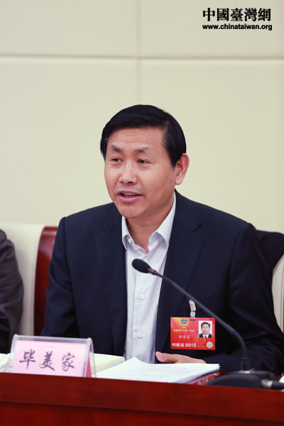 農(nóng)業(yè)部總經(jīng)濟師畢美家在臺盟、臺聯(lián)界別分組討論時表示,兩岸在農(nóng)業(yè)市場方面有相當廣闊的合作空間。(中國臺灣網(wǎng) 于斯文 攝)