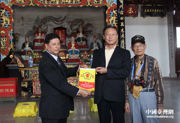 作為基隆市黃氏宗親會(huì)常任理事,臺(tái)灣新浪網(wǎng)記者黃日郎將代表基隆市黃氏宗親會(huì)的旗子鄭重的交到潢川中華黃氏研究會(huì)會(huì)長(zhǎng)黃運(yùn)庚手中,他說(shuō),兩岸黃姓一家人,血濃于水,希望以后有機(jī)會(huì)能帶領(lǐng)基隆市宗親會(huì)會(huì)員到潢川來(lái)拜祖。