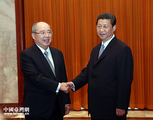 中共中央總書記習(xí)近平13日下午在北京人民大會(huì)堂會(huì)見了中國國民黨榮譽(yù)主席吳伯雄率領(lǐng)的國民黨大陸訪問團(tuán)一行。(中國臺(tái)灣網(wǎng) 王偉 攝)