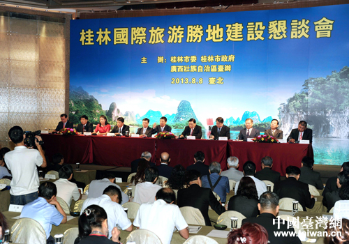 中國臺灣網(wǎng)8月9日臺北消息 8月8日,桂林國際旅游勝地建設懇談會在臺北舉行。臺灣“三三會”會長江丙坤、臺灣海峽兩岸觀光旅游協(xié)會會長謝謂君、臺灣旅游商業(yè)同業(yè)總會理事長姚大光、臺灣工業(yè)總會秘書長蔡練生出席并致辭,桂林市委書記趙樂秦作了國際旅游勝地建設新聞發(fā)布。