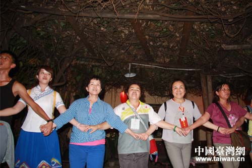 中國臺灣網8月19日恩施消息  19日下午,在參觀了恩施大峽谷和云龍河地縫之后,由臺灣“中華海峽兩岸臺灣原住民暨少數民族交流協會”理事長簡東明率領的臺灣少數民族參訪團體驗了獨具土家族特色的摔碗酒。臺灣少數民族代表與土家族青年都表演了各自的民族歌舞,最后,在場所有嘉賓手牽手圍繞篝火唱起歌跳起舞,在這片歡樂的海洋里為臺灣少數民族參訪團對恩施的參訪畫上了完美句號。