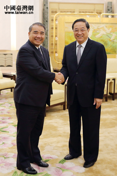 中共中央政治局常委、全國政協主席俞正聲21日上午在北京人民大會堂臺灣廳會見了臺灣少數民族民意代表團一行。(中國臺灣網 于斯文 攝)